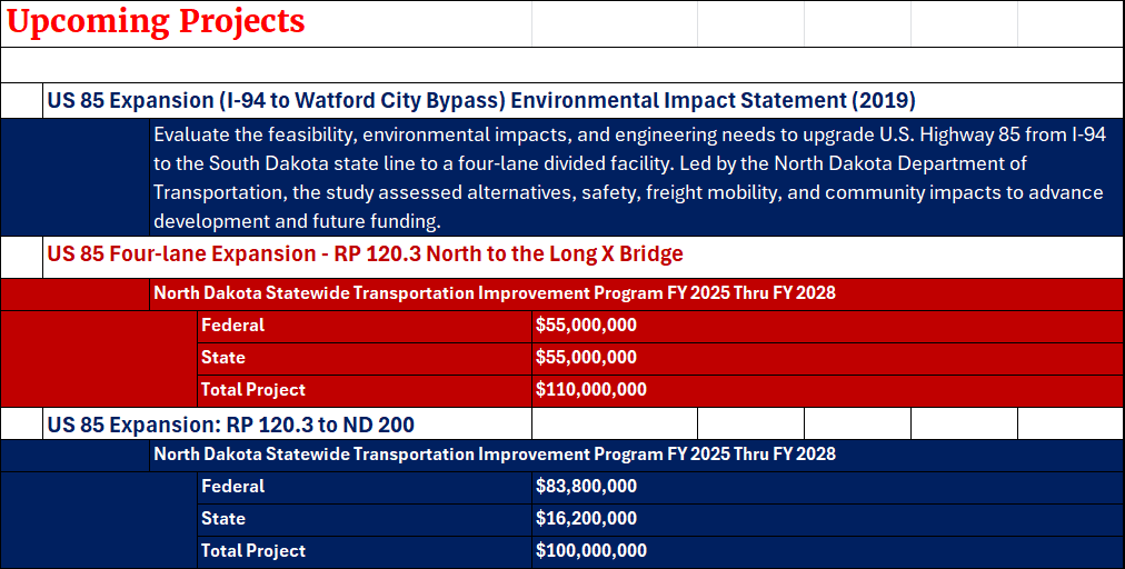 Overall, North Dakota’s approach is clear: lead with large state investments—often from energy-driven revenues—then leverage federal funds to complete high-cost segments, accelerating the full buildout of U.S. 85 toward four-lane, future Interstate standards.